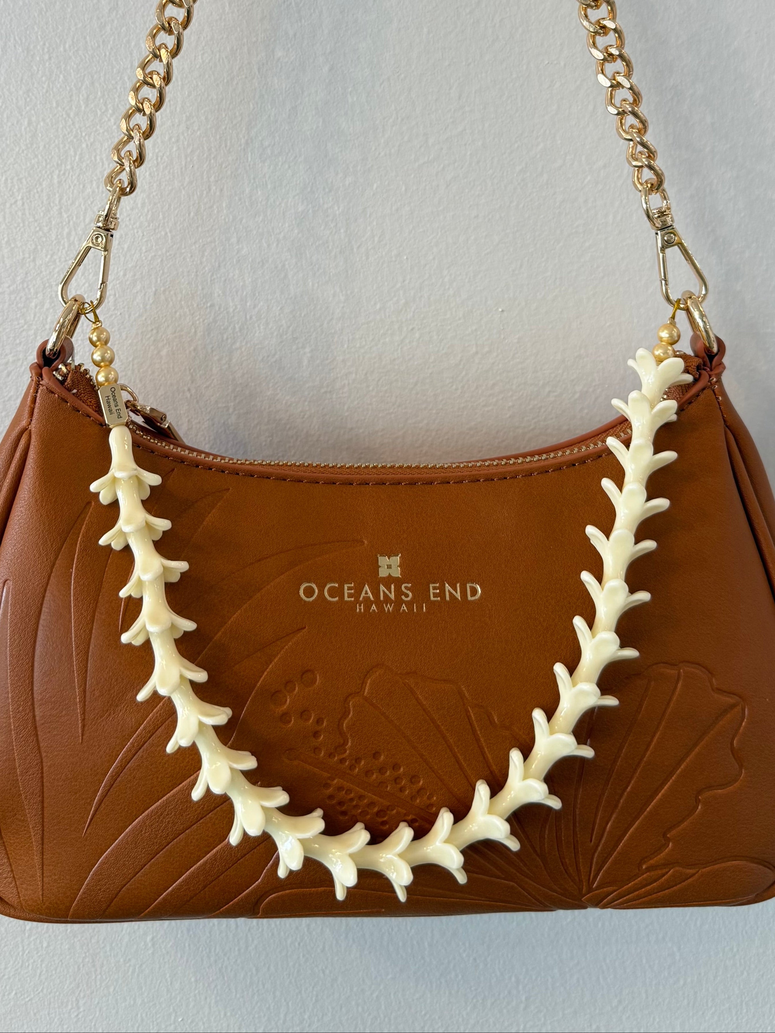 Now you can finally accessorize your Oceans End bag with one our our beautifully crafted lei accessories.  You can clip it on your bag in many ways and interchange them.